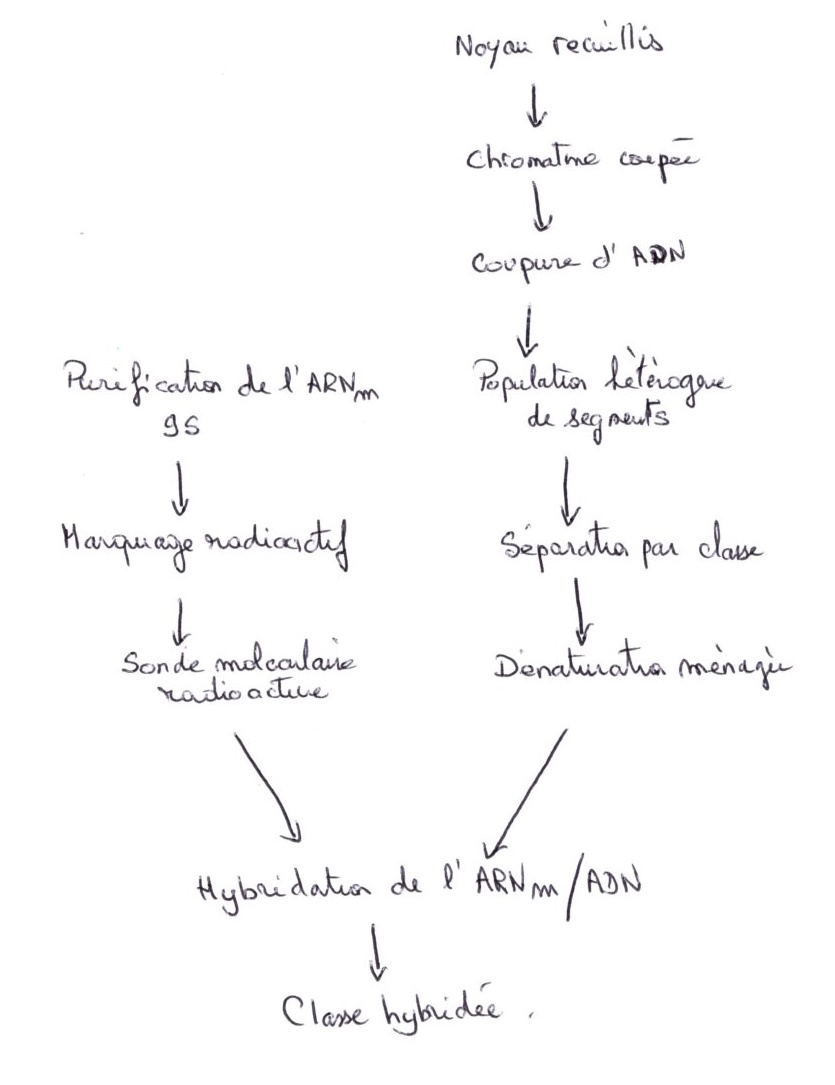 On purifie les ARNm messager 9S matures, traduits en histones dans le cytoplasme. Le marquage radioactif de cet ARNm fournit une sonde radioactive. Parallèlement, la chromatine du noyau est isolée. l'ADN est coupé en segment de restriction de taille inégale, puis séparé par classe de longueur identique. On effectue ensuite une dénaturation ménagée par chauffage modéré pour couper les liaisons hydrogène, puis on effectue une hybridation avec la sonde ARNm/ ADN.