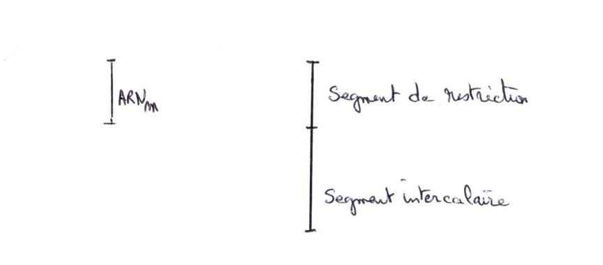 Les lettres correspondant aux introns, les zones complémentaires et hybridées à l'ARN messager (chiffres), sont des exons.