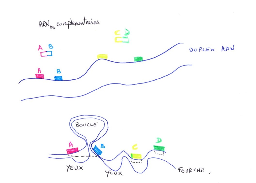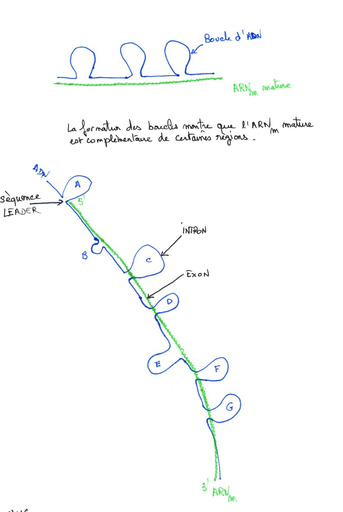 L'ADN (segment de restriction) forme après hybridation, une très grande boucle A, puis des boucles de tailles différentes. L'ARNm s'hybride, en partant de la grande boucle, par son extrémité 5'. La séquence "leader", L, contient les signaux de début de l'ARNm.