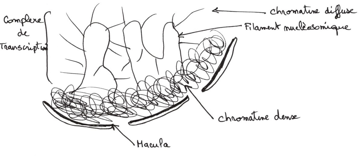 -gènes ribosomaux dans le nucléole, ils sont transcrits en ARN 45s mais non traduits.