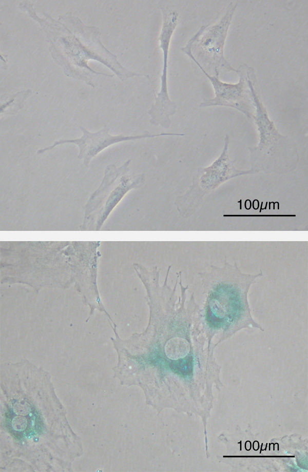 Test de sénescence dans des cultures de fibroblastes de souris embryonnaires (MEF) ou test SABG. (En haut) Avant la sénescence, MEF au 2ème passage après prélèvement. Les MEF ont une forme de fuseau. (En bas) Après le 8ème passage, les MEF se sont agrandis et se sont aplatis. La coloration bleu-vert indique l’expression de la β-galactosidase associée à la sénescence (la coloration est obtenue en présence du substrat X-gal). Source : https://en.wikipedia.org/wiki/Cellular_senescence#/media/File:SABG_MEFs.jpg