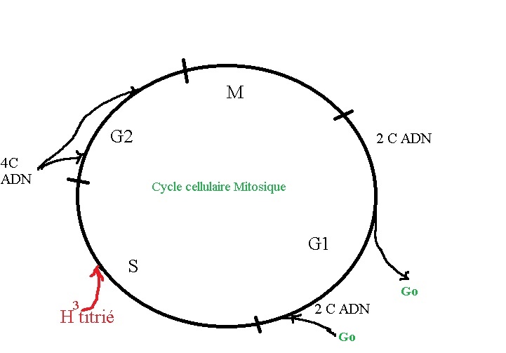 Pour les cellules qui ne se divisent plus, il n'y a pas de phase S, elles vont en phase Go définitivement ou transitoirement. Par exemple: les neurones ou certaines qui sont en attentes de stimulations. Le marquage de l'ADN par la radioactivité (acide animé: thimidine H3 Titrié) se fait pendant la phase S.