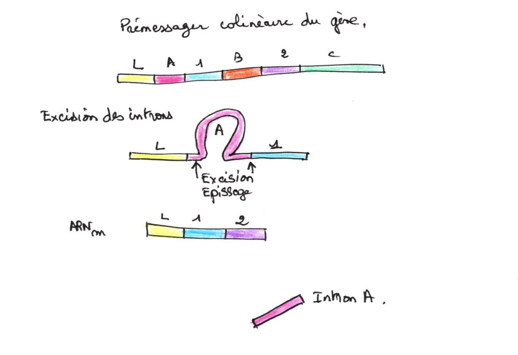 C'est la structure en mosaïque car le gène est une mosaïque d'introns et d'exons, de tailles différentes et seuls les exons se retrouvent dans l'ARNm. Intermédiaire entre l'ADN et l'ARN messager, l'ARNm précurseur comprend les introns et les exons. Les introns sont ensuite excisées pour donner l'ARNm mature, qui passe dans le cytoplasme. Après excision enzymatique, il y a épissage des deux extrémités. Les introns sont libérés et dégradés tout de suite dans le noyau. Le pré-messagers est le seul ARN de même taille que l'ADN.