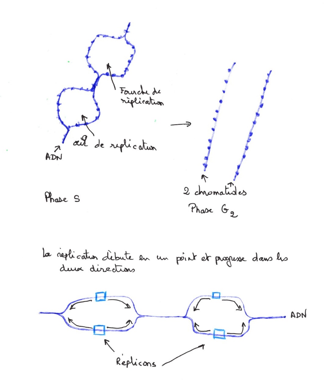 Dès que les nouvelles molécules d'ADN sont synthétisées, il y a fixation des histones et H1 se fixe en dernier pour verrouiller l'ADN. On ne trouve jamais d'ADN dénudé. Dans les embryons en segmentation, il y a beaucoup plus de réplicons que dans les cellules adultes mais ils sont plus petits. La réplication est sous le contrôle de facteurs cytoplasmiques. Pendant la phase G2, la chromatine est dédoublée, cette phase est courte pour les cellules somatiques.