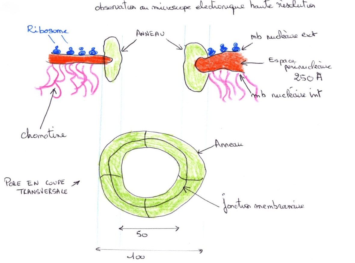 Le complexe du pore correspond à 8 sous-unités qui définissent un tunnel. La chromatine est fortement attachée à la lamina et elle ne flotte pas librement dans le nucléoplasme. Le nombre et la densité des pores sont variables d'une cellule à l'autre et est à peu près proportionnelle à l'activité de transcription.