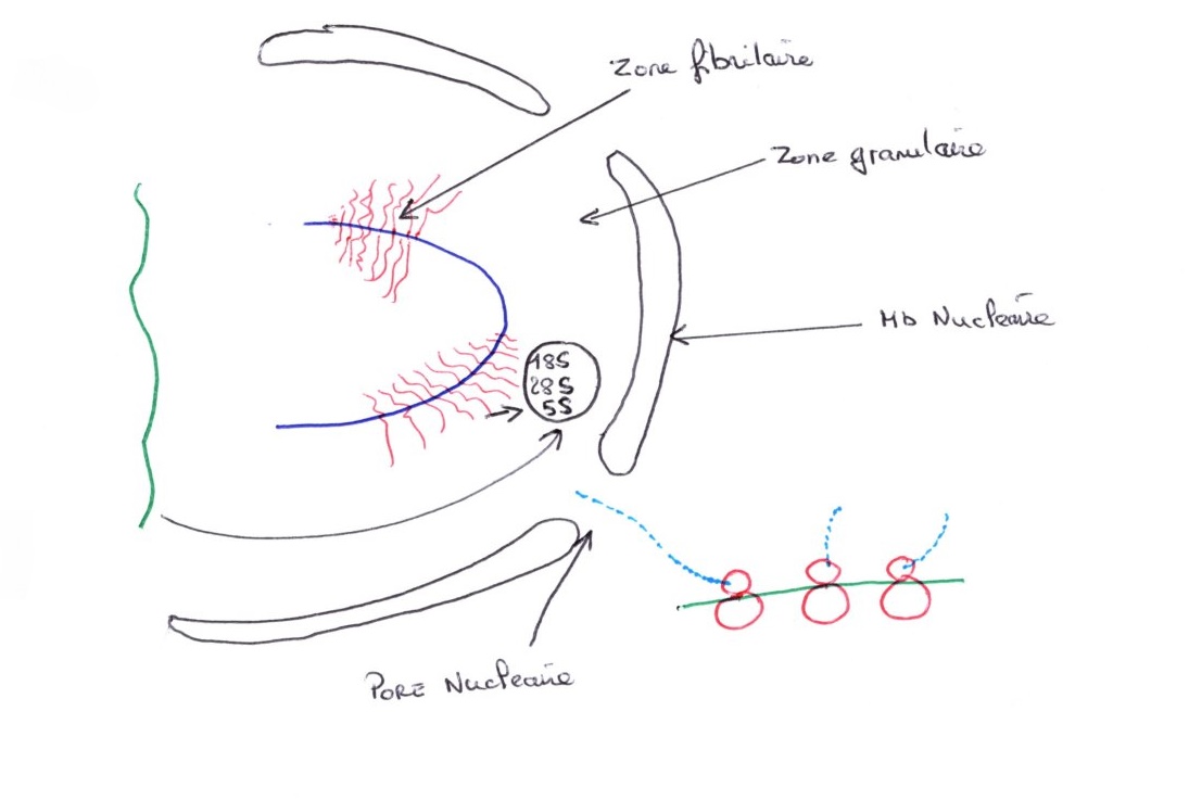 - les pré-ribosomes sont plus gros et seulement 10 % passeront dans le cytoplasme. Leur stockage et leur maturation ont lieu dans le nucléole.