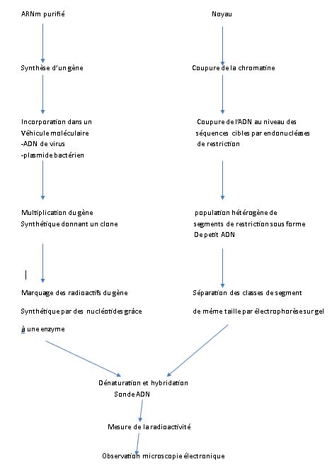 On purifie les ARNm messager 9S matures, traduits en histones dans le cytoplasme. Le marquage radioactif de cet ARNm fournit une sonde radioactive. Parallèlement, la chromatine du noyau est isolée. l'ADN est coupé en segment de restriction de taille inégale, puis séparé par classe de longueur identique. On effectue ensuite une dénaturation ménagée par chauffage modéré pour couper les liaisons hydrogène, puis on effectue une hybridation avec la sonde ARNm/ ADN.