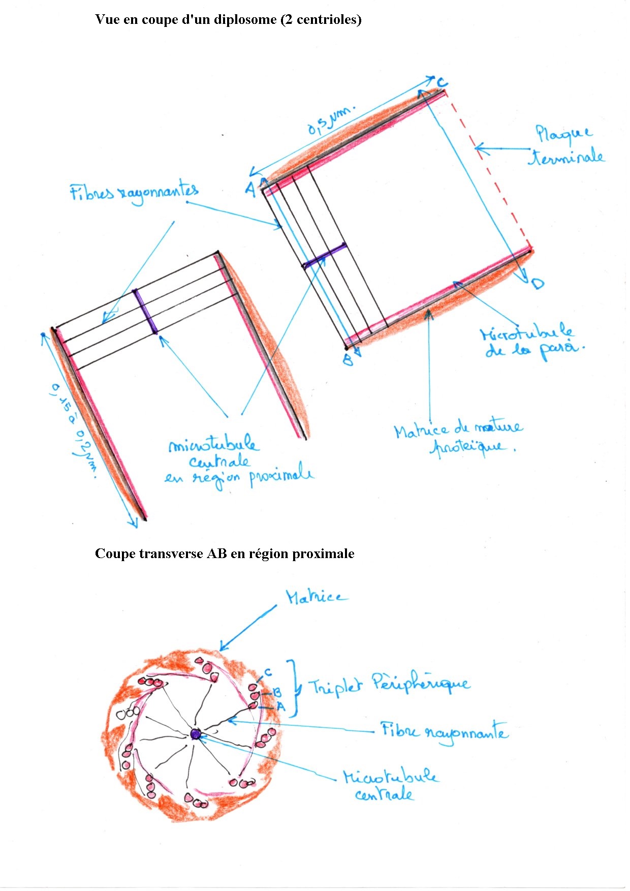 Au microscope optique, on trouve des petits points par paire. Au microscope électronique, on voit deux associations de 2 centrioles représentant de cylindres creux formés de microtubules.