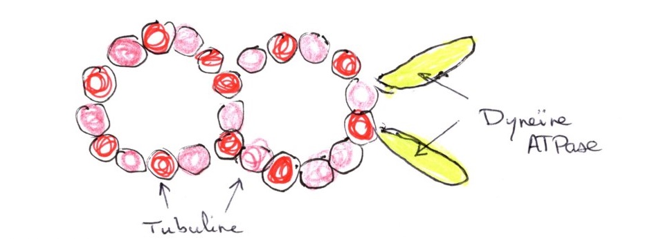 La tubulodynéine à l'endroit où les bras sont fixés, hydrolyse l'ATP en produisant un décalage des sous unités entre elles. Les trois protofilament commun représentent un engrenage. Quand A ce raccourci, il y a courbure d'un côté, puis, quand B se raccourci, il y a courbure de l'autre côté. Ce phénomène est possible du fait de la symétrie des éléments accolés. Le couplage entre l'hydrolyse de l'ATP et l'action tubuline-dyneine entraînent la courbure de A et le mouvement se répercute sur B, tandis que A s'allonge.