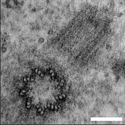 Ci-dessus: Un cil (c) en microscopie électronique en transmission